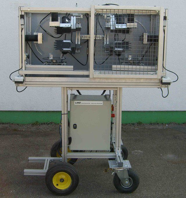 Highly flexible trimming machine. Easy to use. You can drive the machine to the plants or work through the entire bed. No transport time for the plants to the work area. Closing the sliding door starts the trimming process and the job is done.The trimmed plant can be removed. 100% safety. The cutting circumference can be adjusted easily and quickly. We also manufacture custom frames for use between roller tables or individual stations for larger diameters.